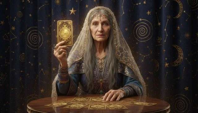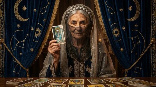 Create an image of an older lady with natural wrinkles and grey hair laying tarot cards. We see her from the front as she holds one card up. Her look is mysterious; she is wearing a veil and the background is a dark blue velvet curtain with golden stitchings of stars, the moon, and star constellations. The style is somewhat between Dune (the movie) and Aladdin, with a shiny gloss on it.