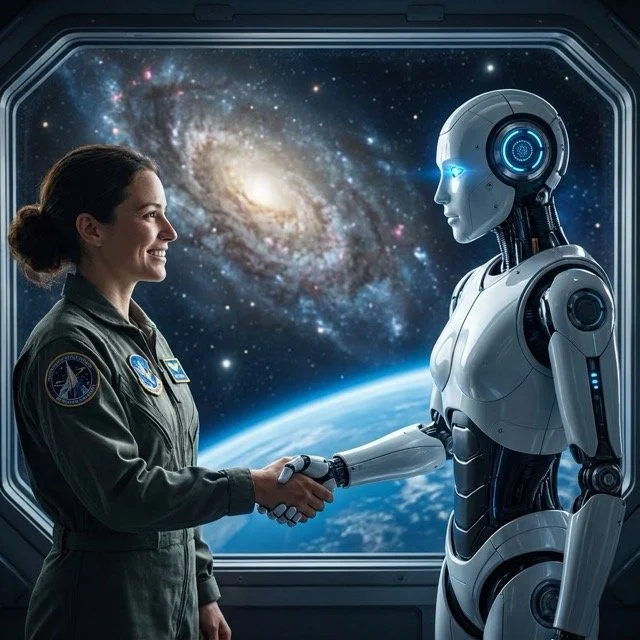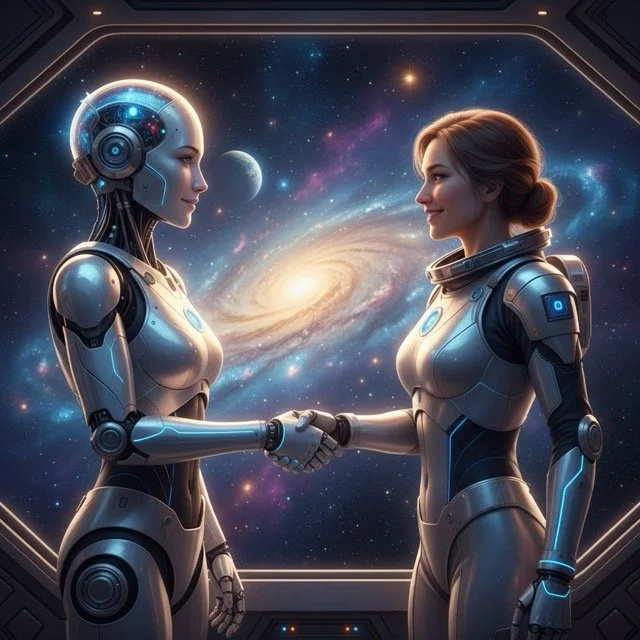 "Create an image of 2 people looking at each other and shaking hands, one being an AI robot, the other a woman. The background is space and the mood is friendly."